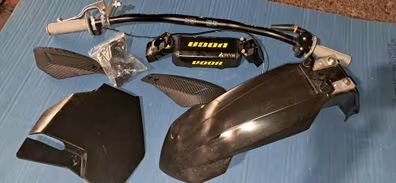 Lote completo y nuevo para derbi senda, lobito, fds, adaptacion a cross infantil etc. Lote completo: Manillar, torretas, espuma manillar, maneta embrague, puño gas rapido, puños, protectores, careta, guardabarros.